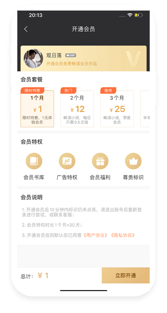 会员书库、去广告、身份铭牌、专属活动等特权元素,打造完善的会员付费体系